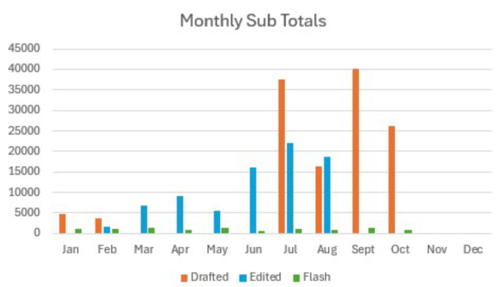 You can see from the graph below when I started writing full-time and how many words I’ve written and edited in the last five months. (Who doesn’t love a good bar chart?!)