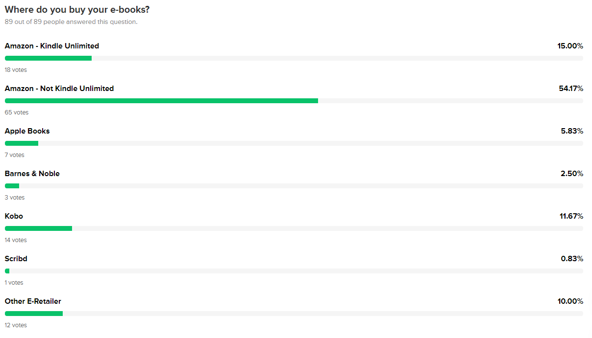 As you can see, 15% voted Kindle Unlimited, 54% prefer Amazon but are not in KU, and 31% in total make use of other retailers. So clearly, Amazon is the way to go.